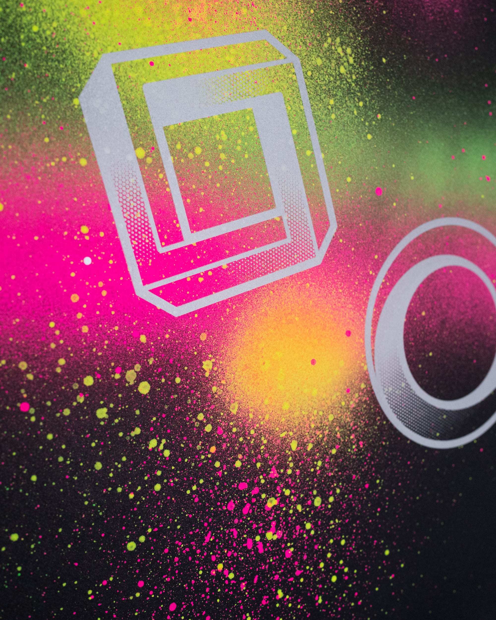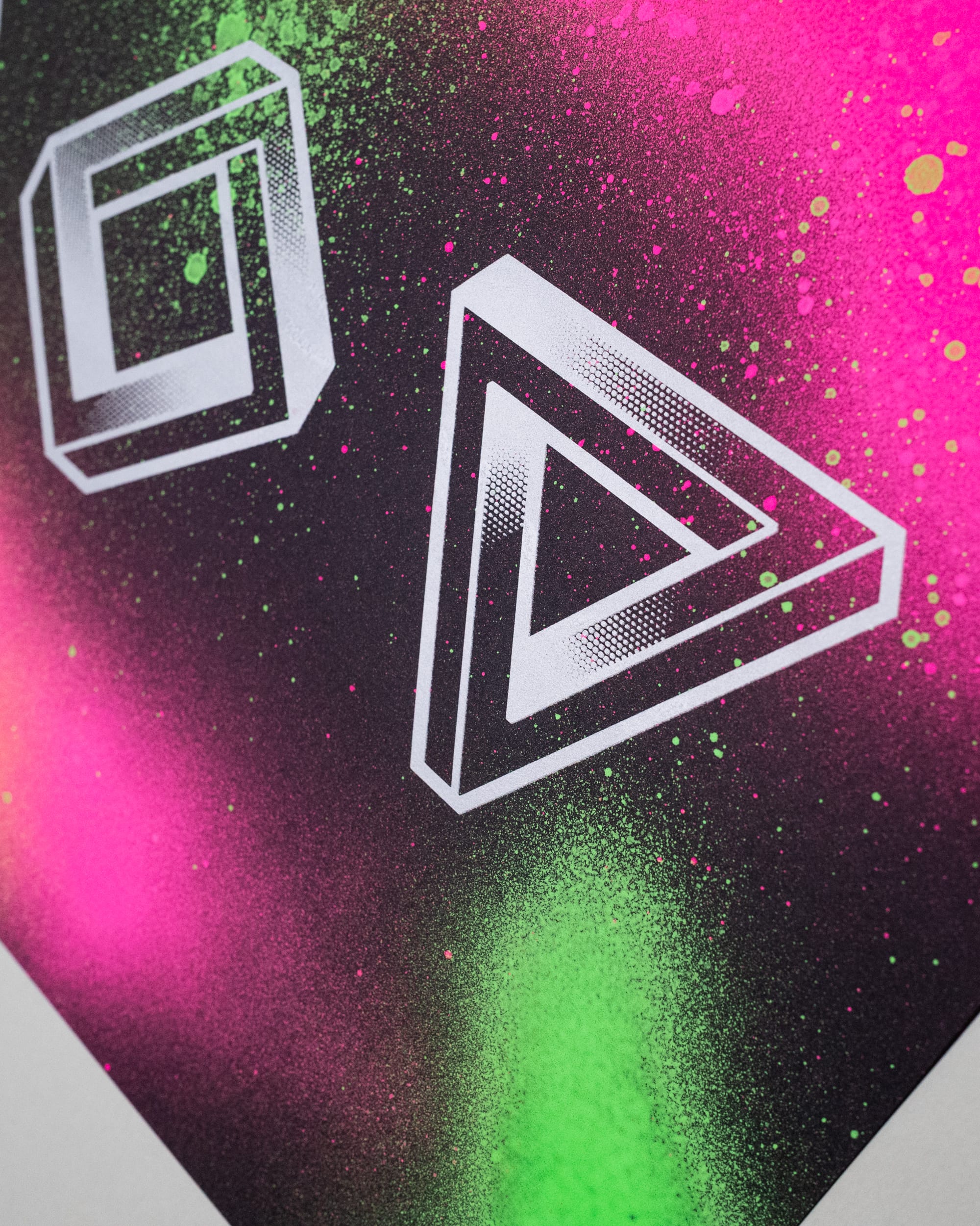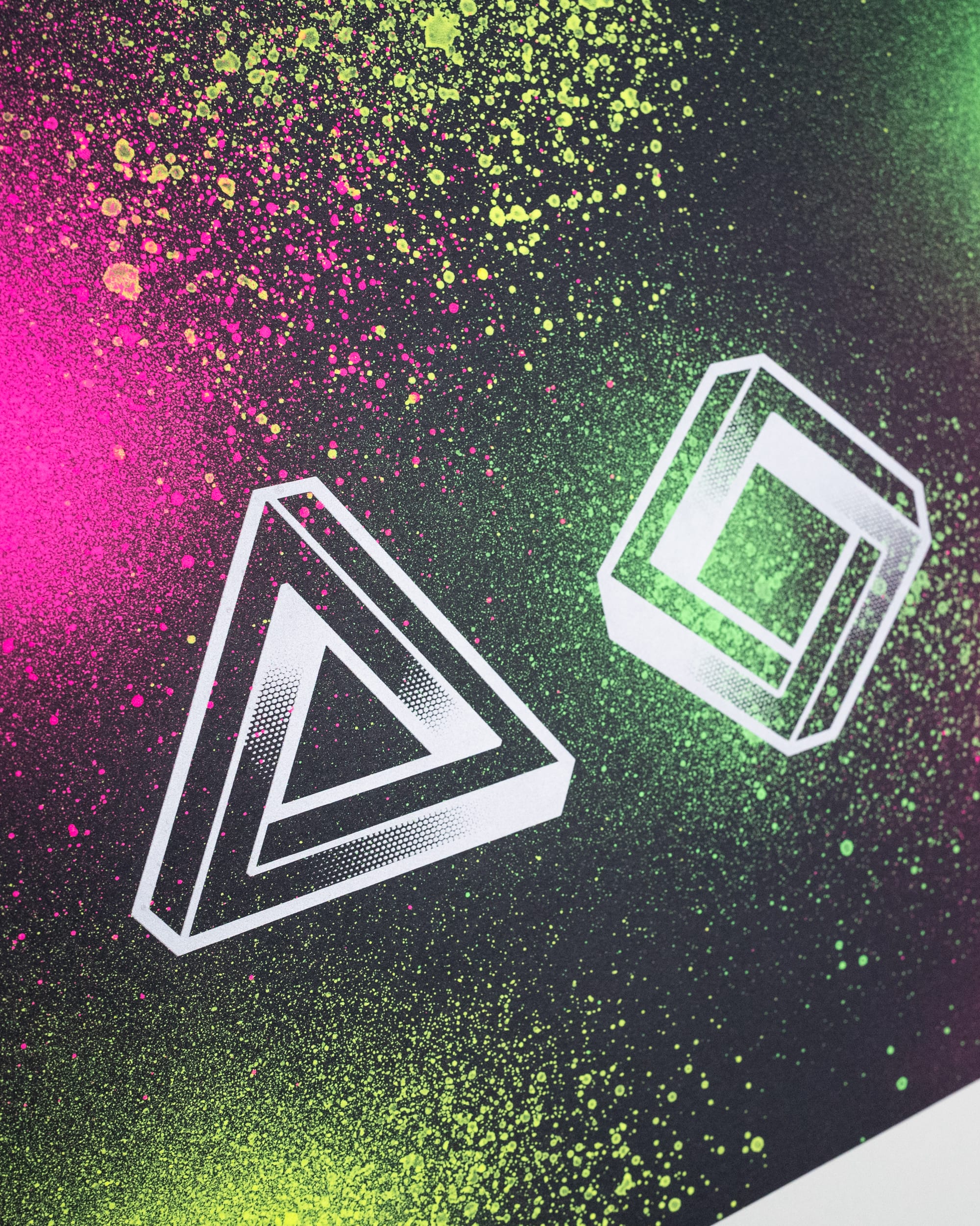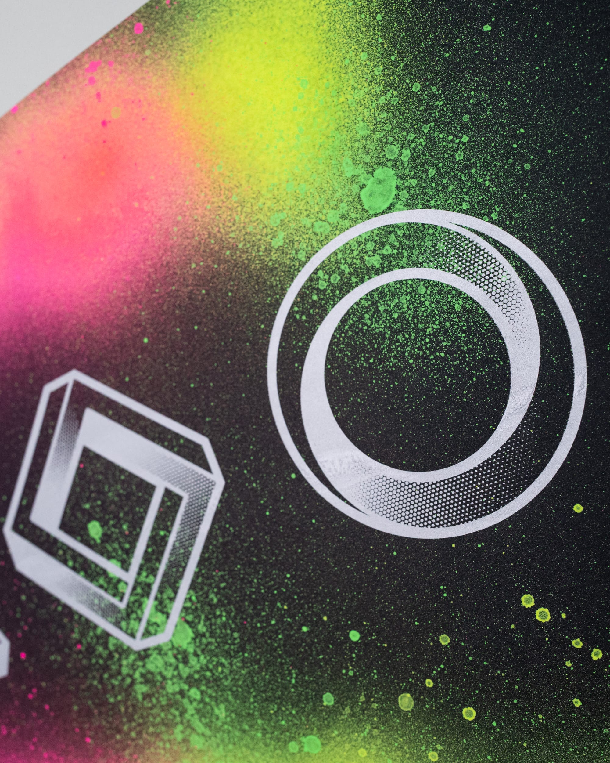 Diese Impossible Shapes sind über bunte Neon-Sprühfarbe gedruckt. Jedes Poster hat dadurch einen anderen, zufälligen Hintergrund der mal flächiger, mal zurückhaltender sein kann. Blickanker sind die Formen in Silber darüber.