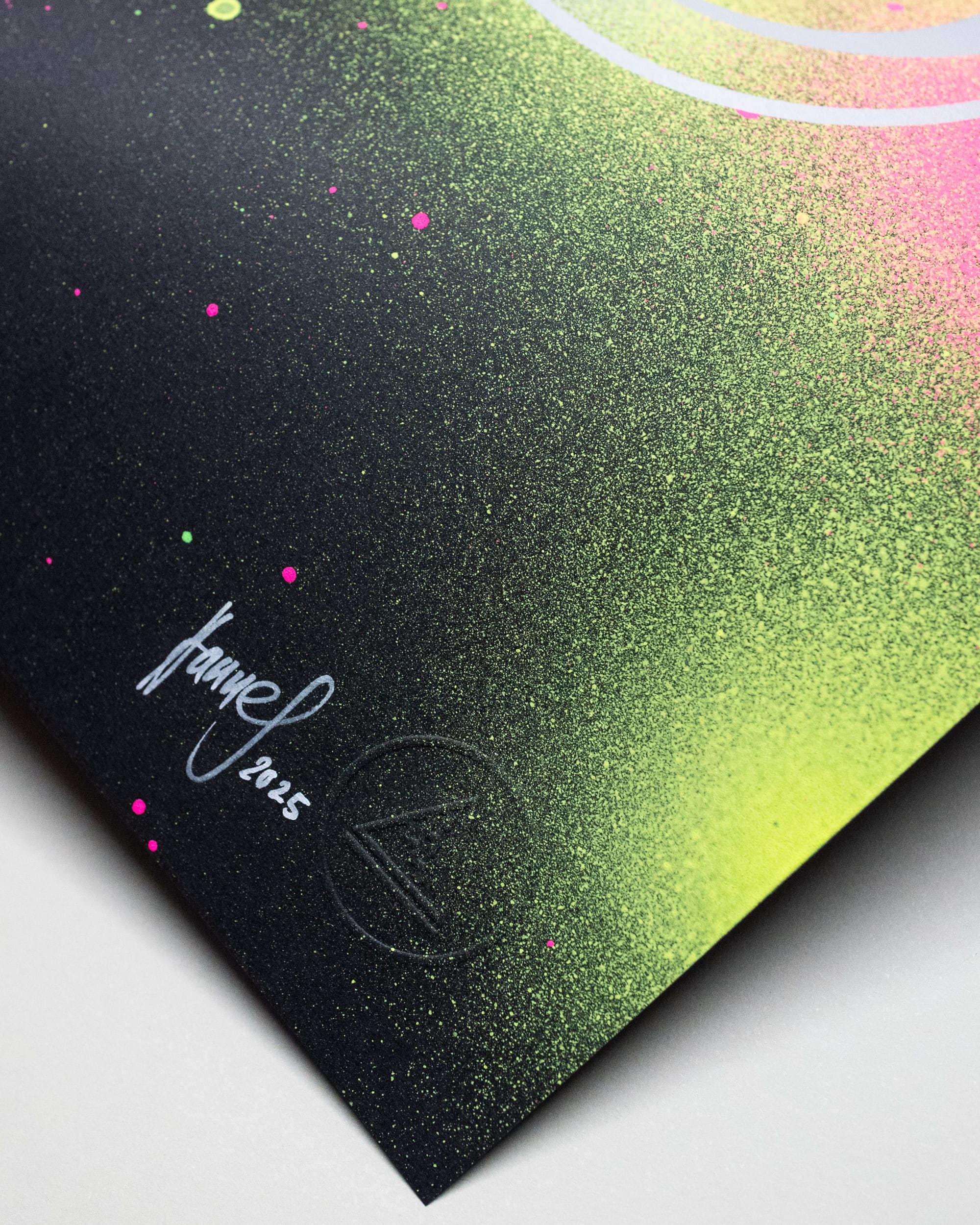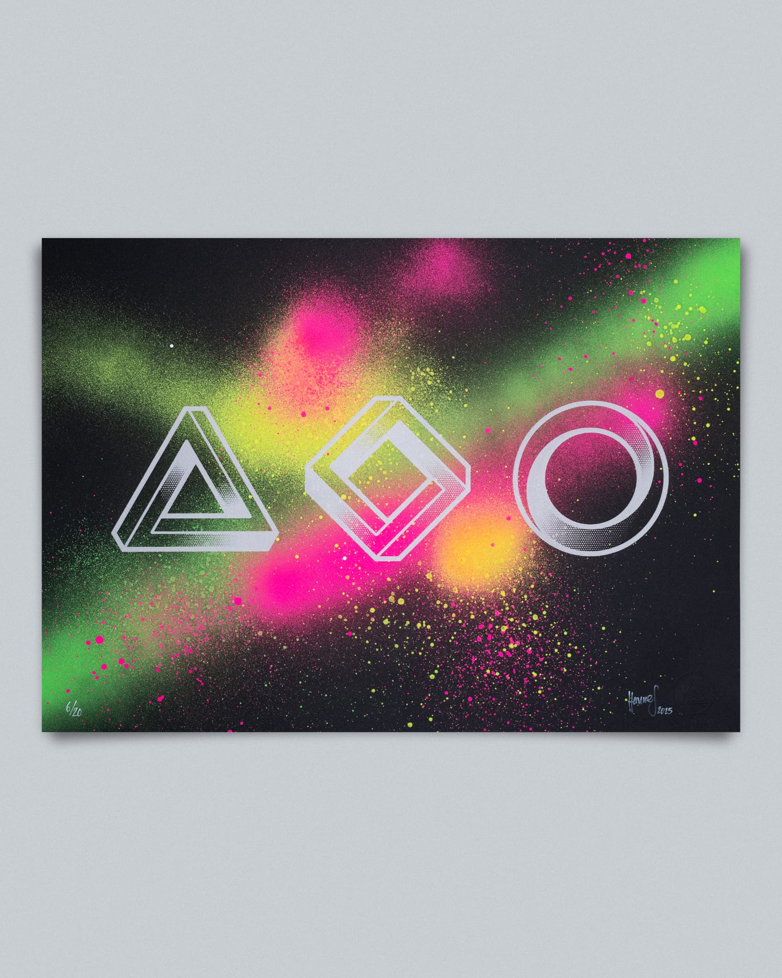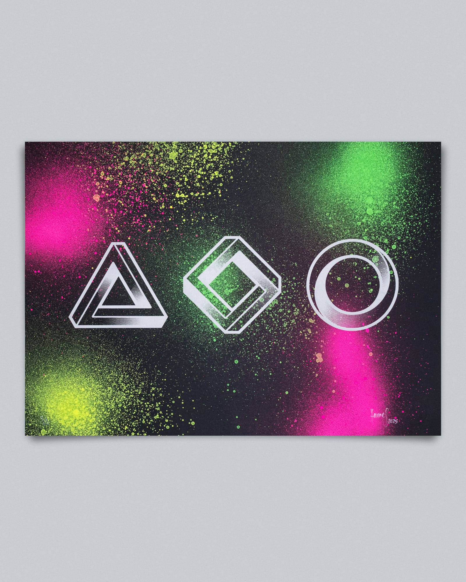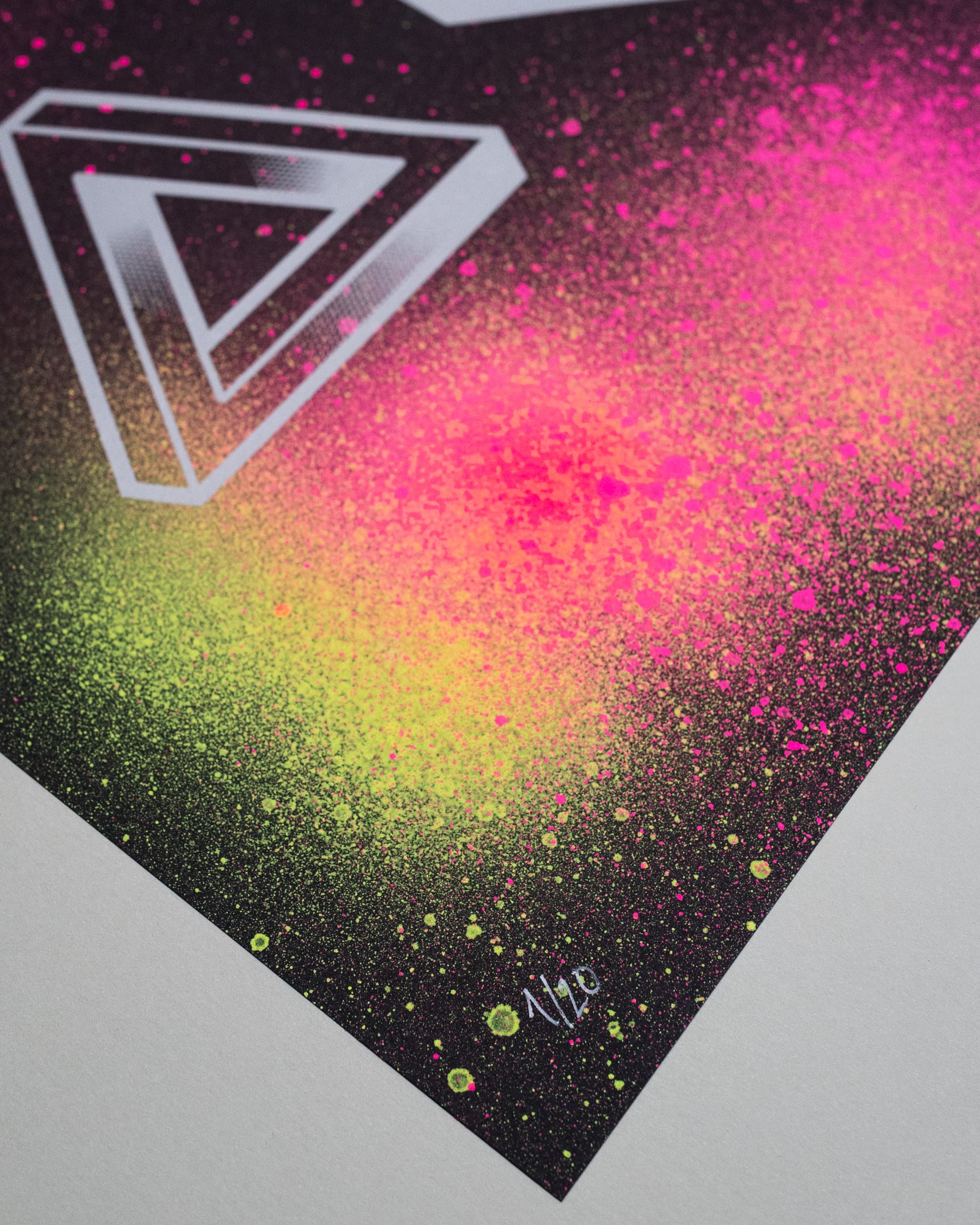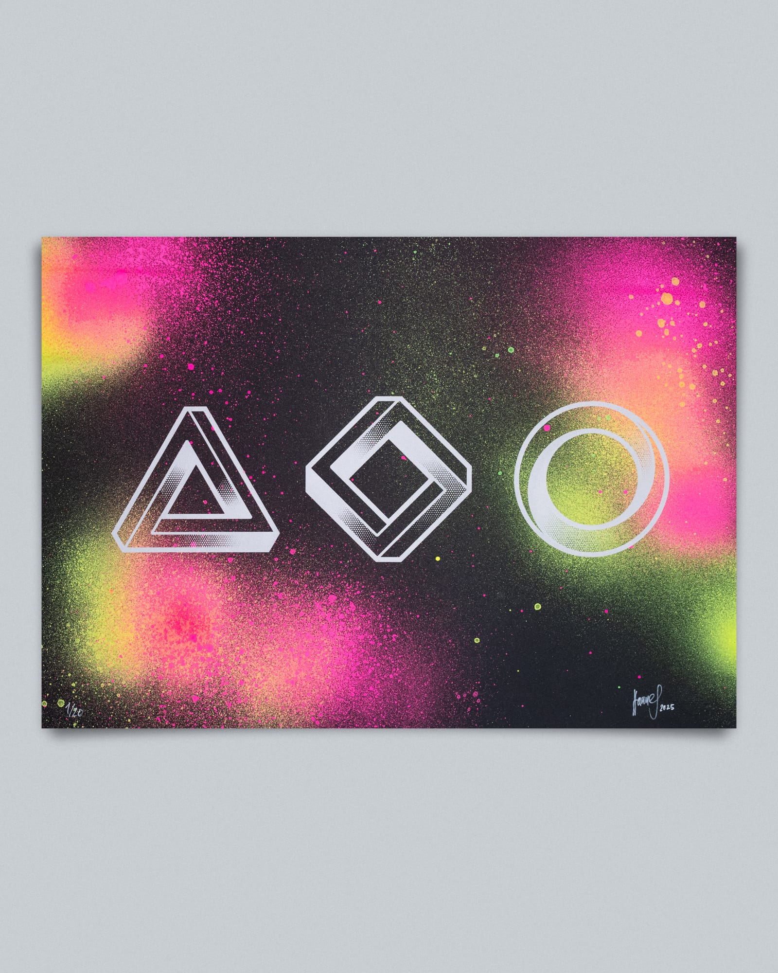 Diese Impossible Shapes sind über bunte Neon-Sprühfarbe gedruckt. Jedes Poster hat dadurch einen anderen, zufälligen Hintergrund der mal flächiger, mal zurückhaltender sein kann. Blickanker sind die Formen in Silber darüber.