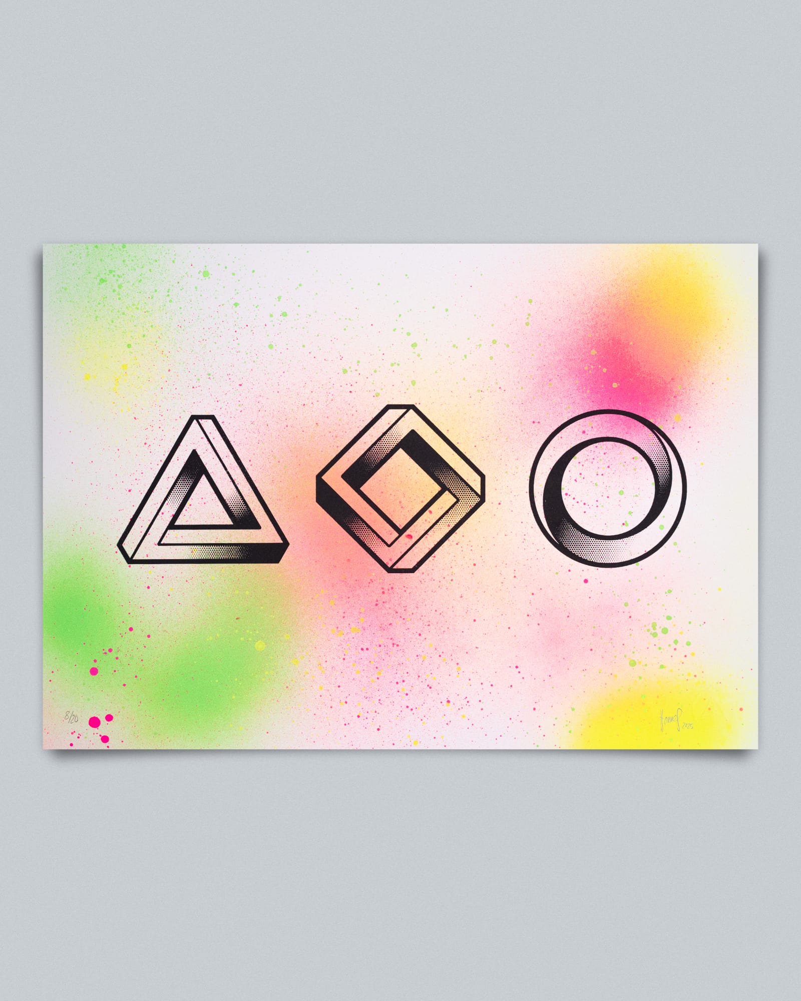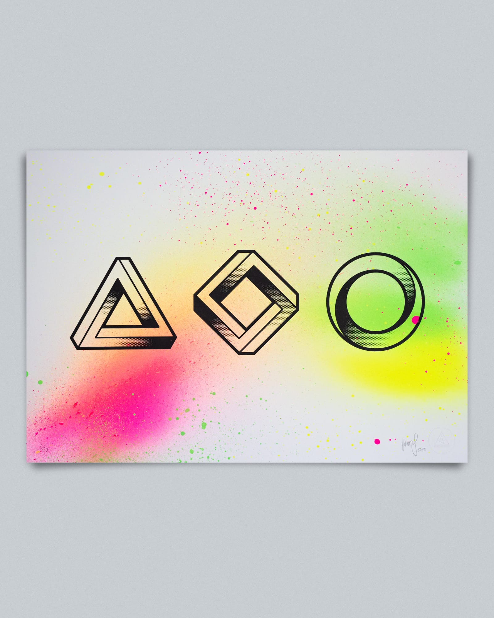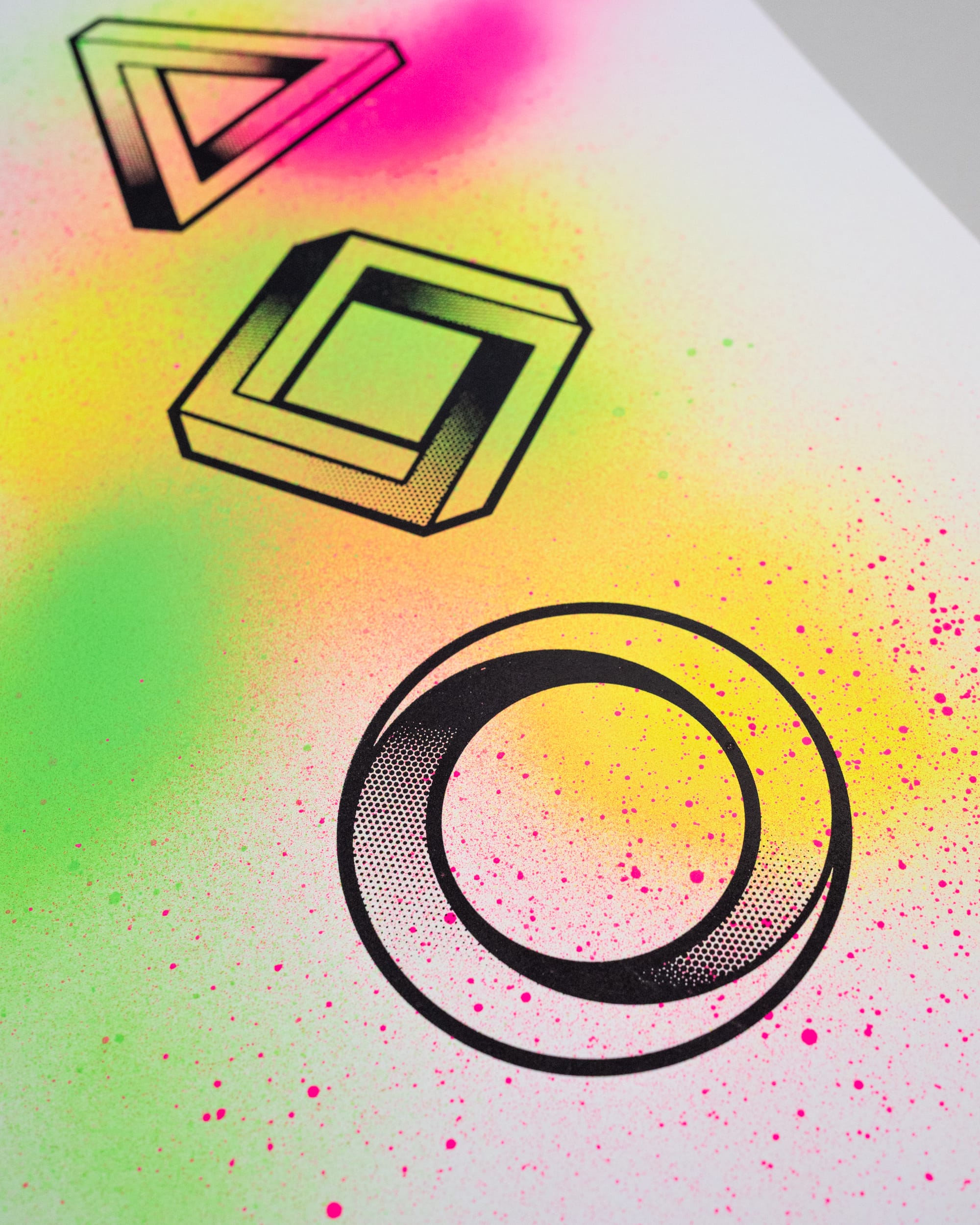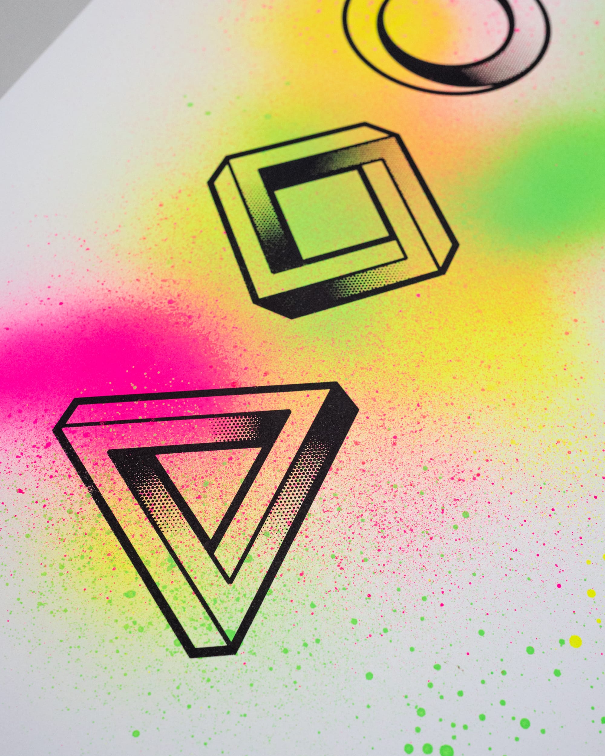 Diese Impossible Shapes sind über bunte Neon-Sprühfarbe gedruckt. Jedes Poster hat dadurch einen anderen, zufälligen Hintergrund der mal flächiger, mal zurückhaltender sein kann. Blickanker sind die Formen in Schwarz darüber.